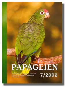 Haltung und Zucht des Guayaquilsittichs Uwe Dotschkis Inhalt: Der Guayaquilsittich (Aratinga erythrogenys) wird bei uns relativ selten gepflegt. Die meisten Halter von Keilschwanzsittichen bevorzugen offensichtlich die farbenfrohen Arten wie Sonnen- (Aratinga solstitialis) und Jendayasittiche (A. jandaya). Wahrscheinlich ist auch die relativ laute Stimme des Guayaquilsittichs ein Grund dafür, dass die Tiere nicht weit verbreitet sind, obwohl man auch Glück haben und ein sehr ruhiges Paar bekommen kann. Guayaquilsittiche sind robuste Vögel, die man auch in einer entsprechend geschützten Freivoliere überwintern kann. Nach einer längeren Eingewöhnungszeit schreiten sie problemlos zur Brut. Die Tucumán-Amazone Angela Pfeffer Inhalt: Früher wurde die Tucumán-Amazone (Amazona tucumana), die lange Zeit als Unterart der Prachtamazone (Amazona pretrei) geführt wurde, nur selten gehalten und gezüchtet. Seit sie jedoch 1989 in Anhang I des Washingtoner Artenschutzübereinkommens aufgenommen wurde, wird ihr von Züchtern mehr Aufmerksamkeit gewidmet. Die Erstzucht gelang 1987 in Deutschland. Noch Anfang der 70er Jahre des vorigen Jahrhunderts war diese Amazone in Menschenobhut fast unbekannt. Ab 1980 wurde sie dann öfter nach Europa – auch nach Deutschland – importiert. Zu dieser Zeit konnte man sie sehr günstig, für nur einige hundert Mark, erwerben. Heutzutage liegt der Preis deutlich höher. Tucumán-Amazonen sollten nicht als Einzelvögel, sondern nur paarweise zur Zucht gehalten werden. Zu bedenken ist, dass sie, wie ihre Gattungsgenossen, vor allem morgens und abends ihre Lautstärke demonstrieren können. Haltung und Zucht des Rosenköpfchens Ralph Schmidt Inhalt: Rosenköpfchen (Agapornis roseicollis) leben in ihrer Heimat in Schwärmen, daher können sie auch durchaus in der Voliere zu mehreren Paaren untergebracht werden. Kleinere Beißereien, denen auch einmal eine Kralle zum Opfer fallen kann, sind allerdings immer an der Tagesordnung. Aber so gewalttätig, wie manchmal beschrieben, sind diese Papageien meines Erachtens nicht. Rosenköpfchen gelten neben Wellensittichen (Melopsittacus undulatus) und Nymphensittichen (Nymphicus hollandicus) als Anfängervögel für Vogelzüchter. Unabhängig davon, ob im Schwarm oder als Einzelpaar gehalten, gilt dies uneingeschränkt. Eine neue Anlage für meine Hyazintharas Hans Jürgen Geil Inhalt: Der Autor stellt in Wort und Bild die neuen Volieren vor, die er für seine Hyazintharas (Anodorhynchus hyacinthinus) gebaut hat. Er schreibt dazu: "Wie heißt es doch so schön: „man lernt nie aus“, und dies trifft nun mal ganz besonders in unserem Hobby zu. Nach fast zehn Jahren erfolgreicher Naturbrut bei Hyazintharas habe ich mich aus später noch zu erklärenden Gründen dazu entschlossen, die großen Aras in eine von mir völlig neu konstruierte Volierenanlage umzusetzen." Misteln als Papageiennahrung Detlev Franz Inhalt: Der Autor hat in Deutschland frei lebende Papageien beim Verzehr von Mistelbeeren beobachtet. Er schreibt: "Von den in Wiesbaden lebenden Papageien konnte ich bisher sowohl Halsbandsittiche (Psittacula krameri) als auch Große Alexandersittiche (Psittacula eupatria) beim Verzehr der Früchte beobachten. Auf typische Reste von Papageienmahlzeiten (abgebissene Äste mit Blättern, an denen sich nur selten Scheinbeeren finden) kann man in den Herbst- und Wintermonaten häufiger treffen. Die angefressenen Früchte finden sich dagegen fast nie, da sie überwiegend an Ästen hängen bleiben." Auf Papageiensuche in Papua-Neuguinea Franz Amberger Inhalt: Der Autor berichtet von seiner zweiten Reise nach Papua-Neuguinea, wo er auf der Suche nach den einheimischen Papageien war. Nach mehreren anstrengenden Touren durch die wilde Landschaft der Insel wurde er mit dem Anblick von Borstenkopfpapageien (Psittrichas fulgidus), Weißbürzelloris (Pseudeos Fuscata), Neuguinea-Edelpapageien (Eclectus roratus polychloros) und Großen Palmkakadus (Probosciger aterrimus) belohnt. Die roten Aras in ihren Lebensräumen Dieter Hoppe Inhalt: Die roten Aras gehören zweifellos zum Schönsten, was die Natur zu bieten hat: zweimal Farbenpracht in höchster Vollendung. Ohne diese Modelle wäre es wohl keinem Maler gelungen, so viel verschwenderischen Farbglanz in einem Bild festzuhalten. Noch gibt es sie als „Originale“, und wir können sie noch immer bestaunen und uns über diese Laune der Natur wundern, freuen und hoffen, dass sie uns und unsere Nachkommen überleben werden. Volker Würth bespricht folgende Veröffentlichung: Low, Rosemary: Pionus Parrots. Dona Publications CR-Ceske Budejovice, 2002. ISBN 80-7322-005-9, 78 Seiten, Format 14 x 20 cm, 24 Farbfotos und 7 Verbreitungskarten; ca. e 20,- . Zu beziehen direkt bei Rosemary Low, P.O. Box 100, Mansfield, Notts, NG 209NZ, England Im Kleinanzeigenteil der Zeitung haben Abonnenten Gelegenheit, kostenlos ihre Papageien anzubieten, zu tauschen oder zu suchen, bzw. Kontakt mit anderen Papageienfreunden aufzunehmen. In der aktuellen Ausgabe sind mehr als 700 private Kleinanzeigen veröffentlicht. |